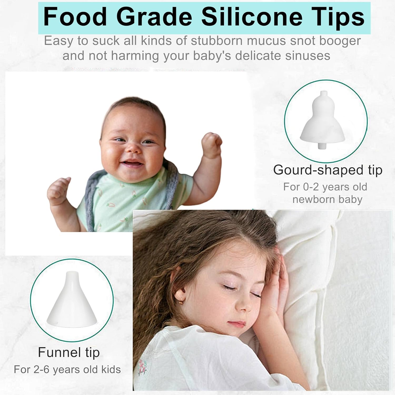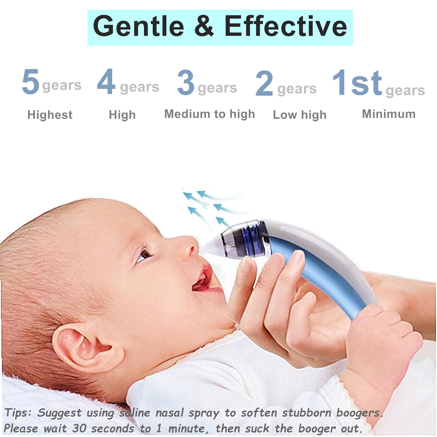 Echipat cu 5 niveluri de putere, aspiratorul îndepărtează eficient mucusul, fie că este vorba de o răceală ușoară sau o congestie severă. Motorul silențios permite utilizarea chiar și în timpul somnului.